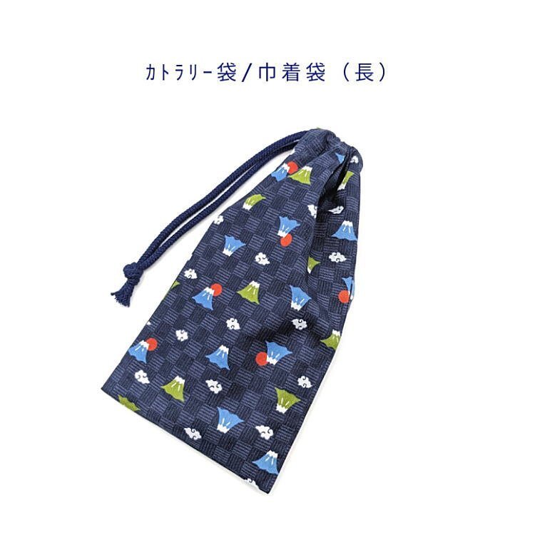 - カトラリー袋・巾着袋 長方形【和柄 富士山柄 ネイビー】カトラリーケース 箸袋 はし袋 コップ袋 給食袋 ポーチ 収納袋 福福 縁起物