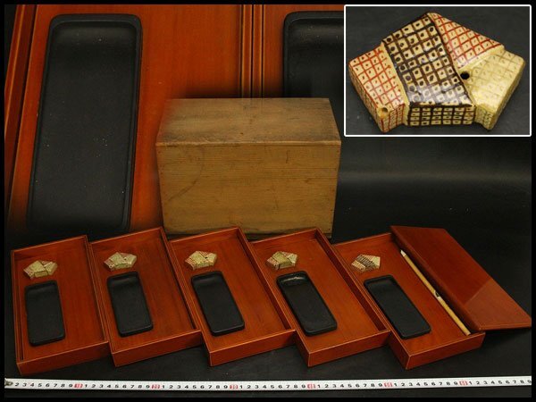 - 【銀閣】漆 溜塗 重硯 色絵 結び陶水滴 旧家蔵出 送料無料(A915)