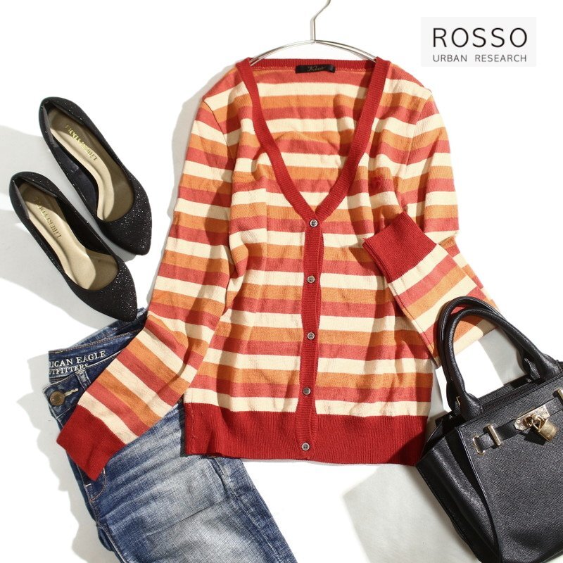> 美品 ROSSO ロッソ URBAN RESEARCH アーバンリサーチ 秋 冬 きれい色 ウール アンゴラ Vネック ボーダー カーディガン F オレンジ レトロ