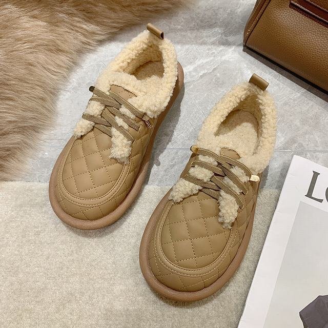 - モカシン ムートンパンプス ボアシューズ キルディング ファーシューズ レディース 裏起毛 フラットシューズ 防寒 靴 カーキ24.5 cm