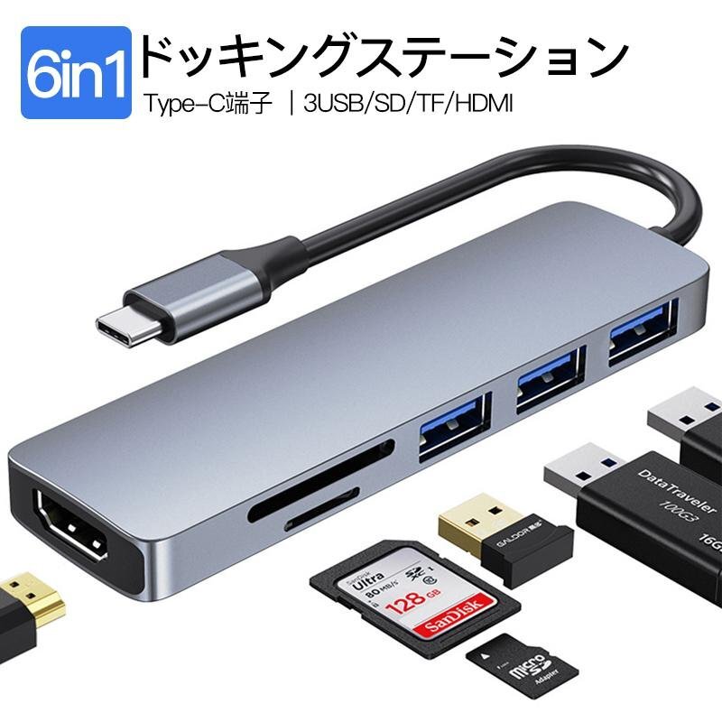 - Type C ハブ USB C ドッキングステーション USB C HUB 6in1 USB3.0 HDMI 変換 SDカードリーダー 889