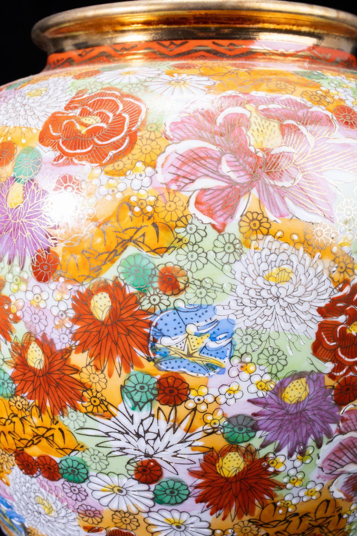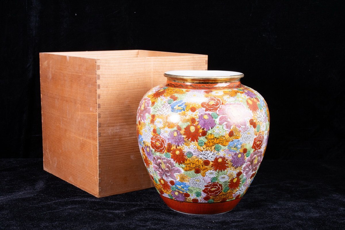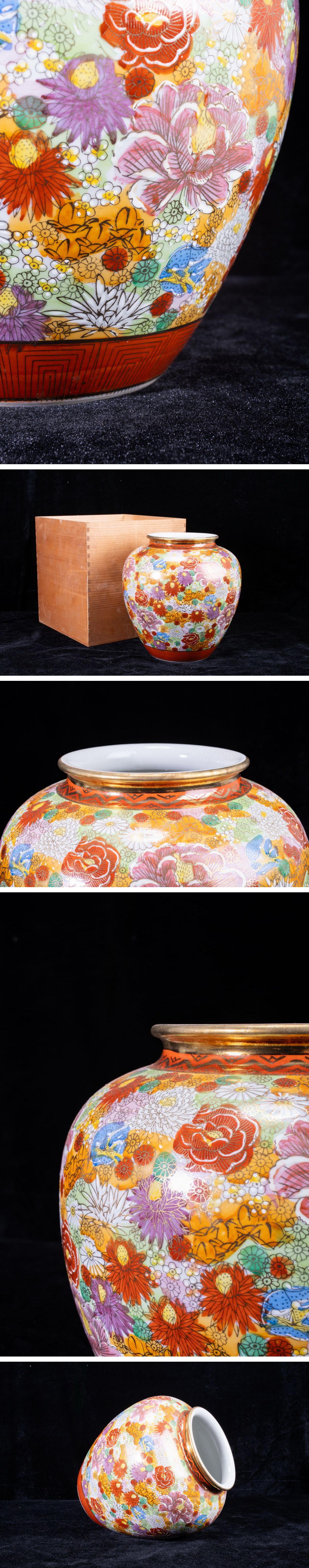 - 【珍品堂】1円から N32-V2 九谷焼 春洋 作 在銘 金彩 色絵 百花詰 細密絵付 豪華 花瓶 高25㎝ 木箱 花器 希少 飾壺 時代物 骨董品 古美術