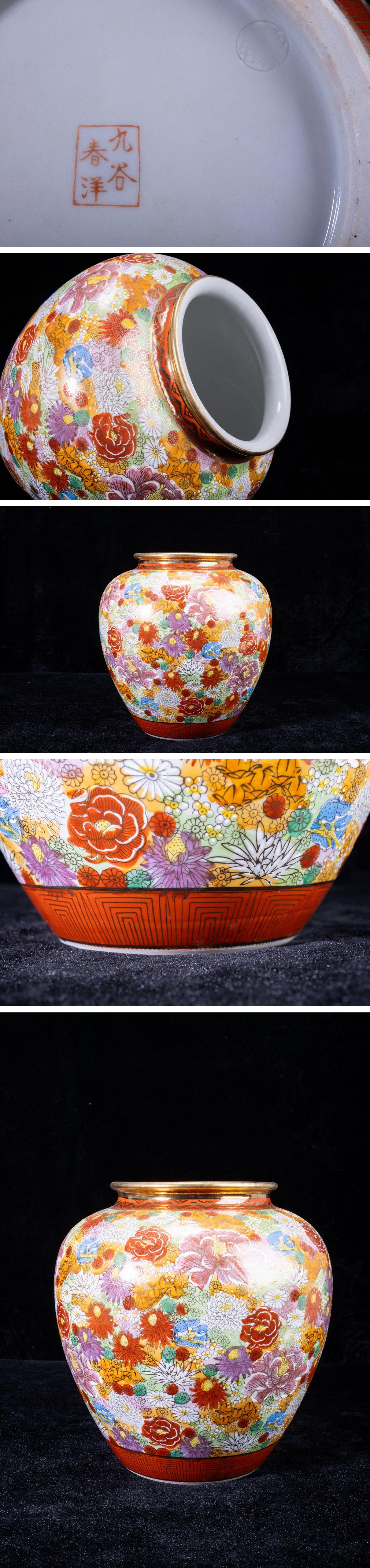 > 【珍品堂】1円から N32-V2 九谷焼 春洋 作 在銘 金彩 色絵 百花詰 細密絵付 豪華 花瓶 高25㎝ 木箱 花器 希少 飾壺 時代物 骨董品 古美術
