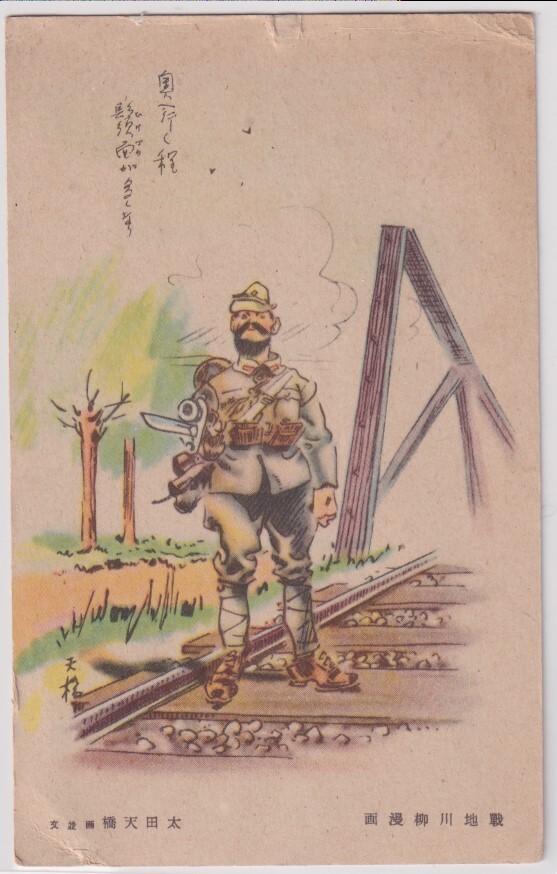 - 絵葉書/戦地川柳漫画/奥に行くほど 乃木2銭貼 ク/鏡城/17.4.25/★ 朝鮮8513部隊