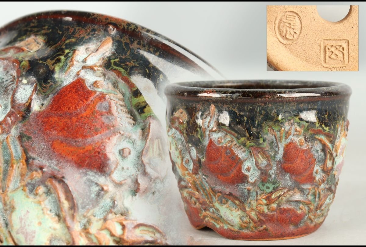 - [URA]岡谷是心/蟹盆栽鉢/10-11-118 (検索)骨董/朱泥/和鉢/盆栽鉢/盆器/豆鉢/小鉢/丸鉢/豆盆栽/盆器/樹盆/水石/水盤/蘭鉢/ミニ鉢