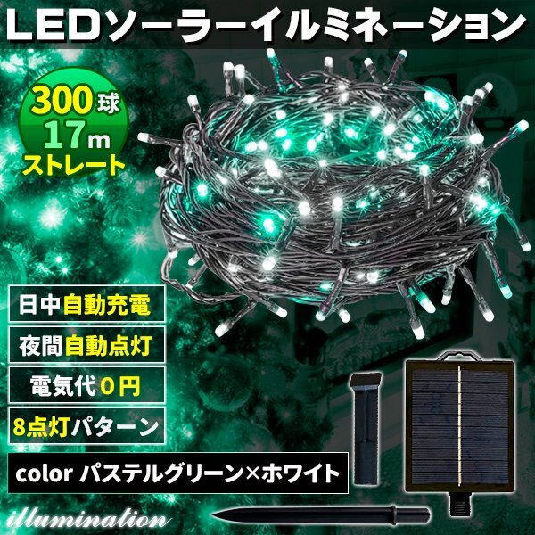 - ソーラー イルミネーション 屋外 クリスマス ストレート 屋外用 イルミネーションライト 300球 パステルグリーン×ホワイト