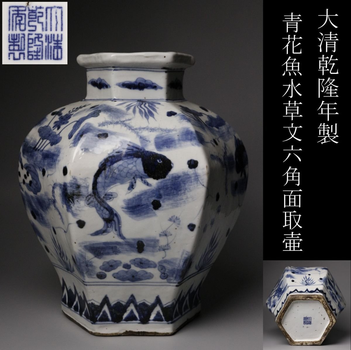 - 【LIG】中国美術 大清乾隆年製 青花 魚水草文六角面取壷 25.5㎝ 花器 古染付 時代古玩 [.EI]25.7