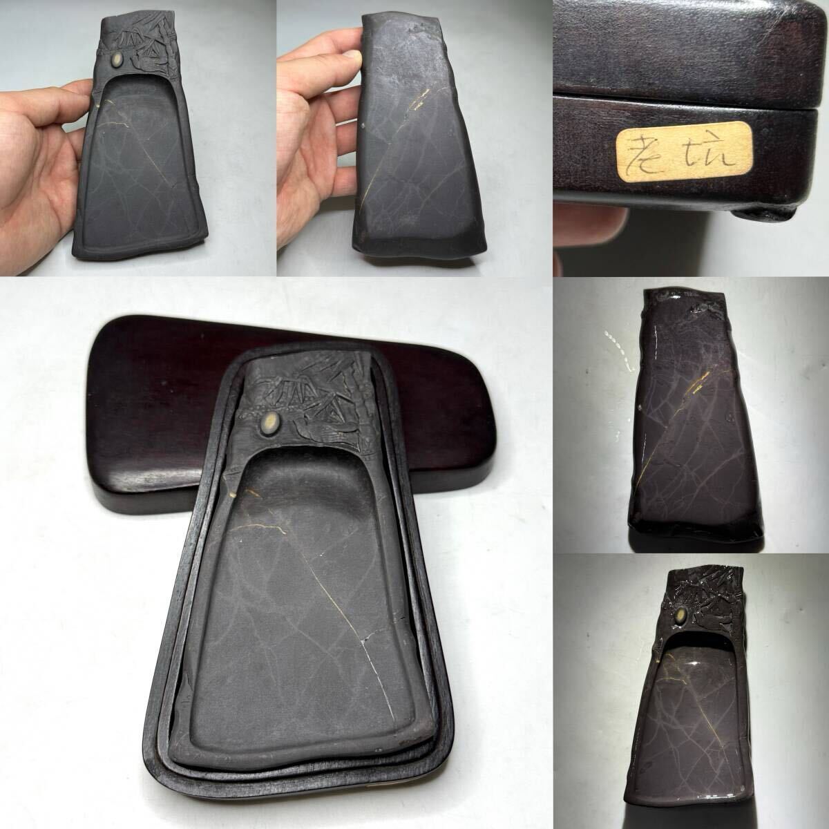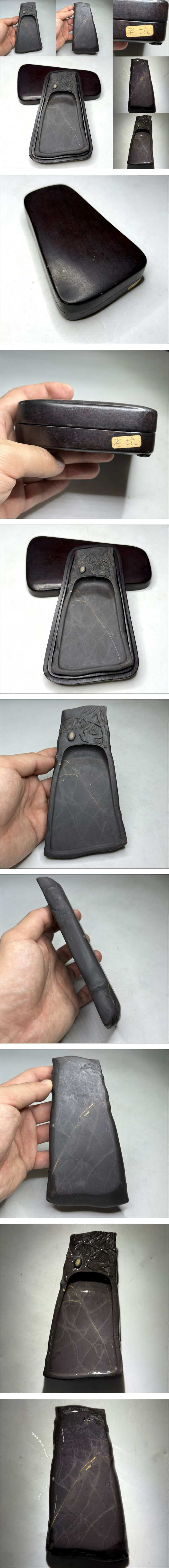 - 時代物 書道家放出品 端渓硯 老坑 水巌 竹鳥文硯 氷文 金銀線 眼 共箱付き(書道具 唐物 中国美術 文房具 煎茶道具)