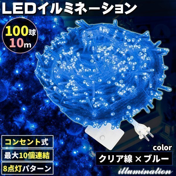 > AC式 イルミネーション コンセント 連結可 LED イルミネーションライト ツリー ライト 100球 100灯 10m 透明線 ブルー
