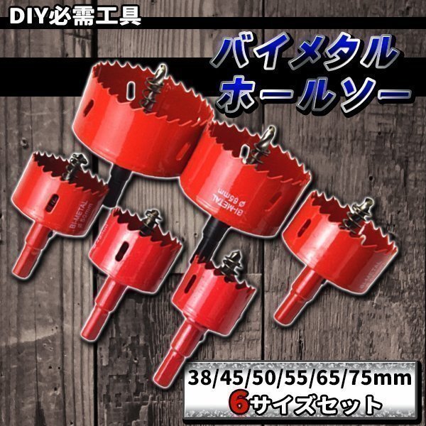 - バイメタルホールソー ホルソー 6本 セット 38 45 50 55 65 75mm ドリル 工具 穴あけ ビット ステンレス 金属 用 木工