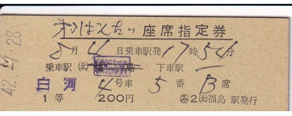 - 鉄道切符 硬券 ばんだい 座席指定券(1等) 白河から 裏面英文