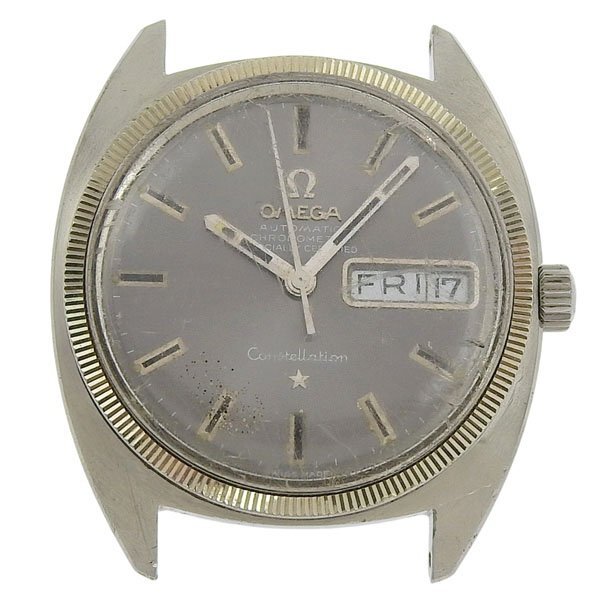 | 当店の時計は基本的にオーバーホールをしてません。記載の不備や付属の欠品、動作異常につきましてはご注文のキャンセルにて対応いたします。時計の修理や、部品の交換は対応できません。あらかじめご了承ください。 防水性の保証はしておりません。また、購入後の修理につきましては、いかなる理由があっても修理費の負担などは一切いたしません。 | | TY002182 ●ブランド オメガ ●モデル名 コンステレーション クロノメーター デイデイト ●性別 メンズ ●ケース素材 SS ●ベルト素材 ― ●風防素材 プラスチック ●文字盤色 シルバー文字盤 ●機械タイプ 自動巻き ●Ref.No ― ●シリアルNo ― ●ケース幅(リューズ除く) 約 34 mm ●腕周り(最長) 約 - cm ●ラグ幅 約 19 mm ●付属品 なし(本体のみ) ●風防 スレ、キズ、ヨゴレ ●ケース スレ、キズ、ヨゴレ ●ベゼル スレ、若干変色 ●針 腐食、夜光取れ ●文字盤 腐食 ●ベルト/ブレスレット ― ●日差(平置き) -47~-50 ●備考※特記事項 ― ●本体ランク C ●ベルトランク ― <ご購入時の注意点> 商品以外に付属している袋や箱はランクに含まれておりません。 画像以外の付属品はありません。ハンガーも対象外です。 モニターやカメラの特性上、画像と実物の色が多少異なる可能性がございます。 必ずご入札前に当店のお取引ガイドをご確認ください。 同意の上で入札をお願いいたします。 中古品という事をご理解の上、ご入札をお願いいたします。 営業時間外での入札取り消しは対応できませんのでご注意下さい。 ご落札後に商品の状態についての質問は受け付けておりませんので、気になる事がございましたら必ずご入札前にご質問下さい。 原則として、お客様のご都合による返品、交換はできません。 お客様のご都合によりお取引をキャンセルする場合は、『落札者削除』となります。 ヤフーオークション以外の販売や直接取引等の理由により出品をキャンセルさせて頂く場合がございますので、あらかじめご了承下さい。 新規のご入札の方、マイナス評価が多い方などはこちらから予告無しに削除する場合もありますので予めご了承ください。 (1)落札後に落札通知メールが自動的に送信されます。 (2)落札日を含め5日以内に「購入手続き」を進めてください。 ※商品ページの「取引ナビから購入手続きする」をクリックすれば購入手続きができます。 ※期間内に購入手続きがない場合はキャンセルとなります。 (3)決済確認後、3日以内に商品を発送いたします。発送時に当店からメールをお送りいたします。 落札金額+送料+消費税がお支払い金額になります。 【決済方法】 銀行振り込み・クレジットカード ※領収書、注文明細につきましてはPDF形式の電子領収書でのご提供とります。 決済確認より1~3日以内に発送いたします。休業日は除きます。