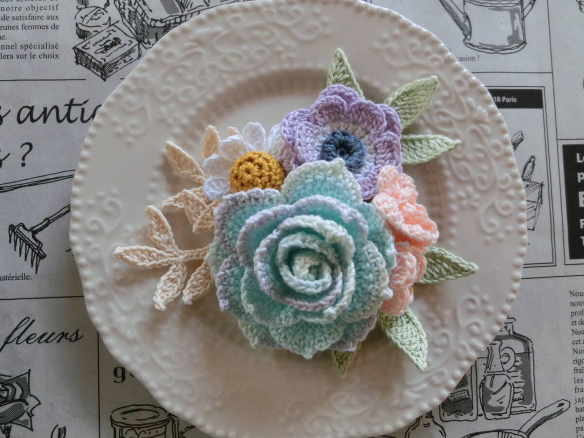 - ☆ 2509 薔薇と小花のブーケ 水色系薔薇 クロシェレース コサージュ ハンドメイド