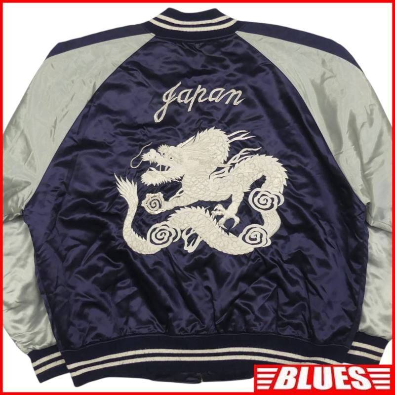 - 即決★N.B.★メンズ XXXL スカジャン ジャケット 刺繍 サテンジャケット ネイビー シルバー 和柄 JAPAN 龍ドラゴン 中綿入り キルティング