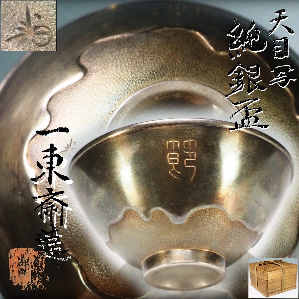 > 【治】『一東斎』造 純銀製 天目写 純銀盃☆共箱 銀重 54g (検索:金工 天目茶碗 銀杯 銀盃 ぐい呑み 煎茶碗 酒器 銀盃) 本物保証 ON79