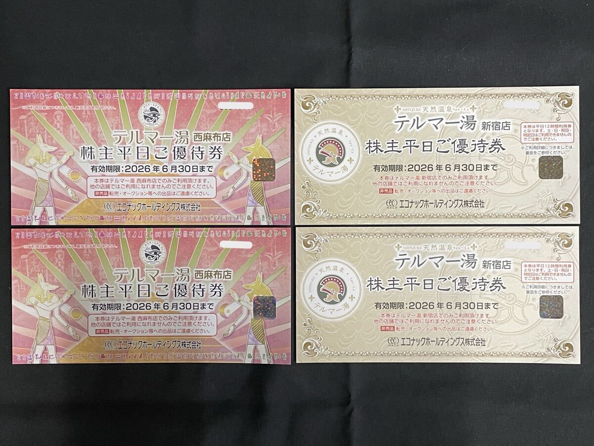 - 【6KT016】1円スタート テルマー湯 平日 優待券 4枚 (西麻布店×2新宿店×2) 有効期限2026年6月30日 現状品 エコナックホールディングス