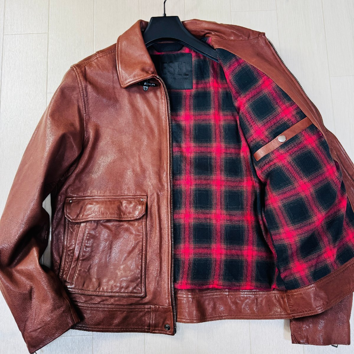- 美品/XL-XXL相当★ディーゼル DIESEL 羊革 ラムスキン レザージャケット ブルゾン ライダース チェック総柄 フック金具 メンズ 茶