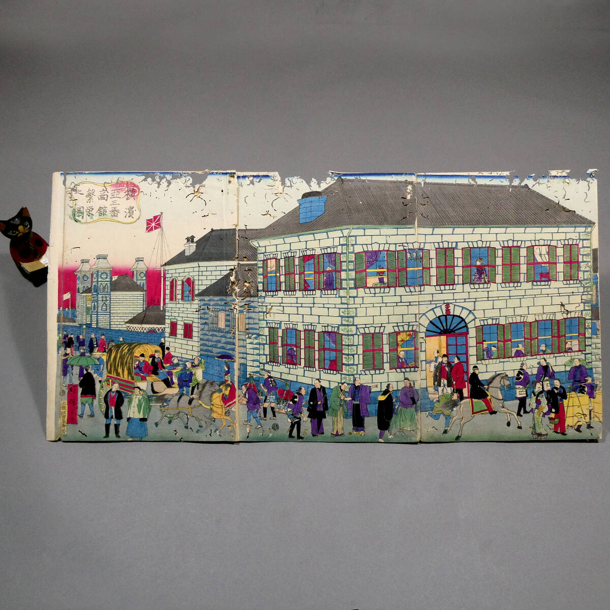 - 横浜開港◆明治初年 アメリカ商館「横浜亜三番商館繁栄之図」3枚続揃い◆広重三代 木版浮世絵◆石張り建築 イギリス領事館 黒船 中国清人 7