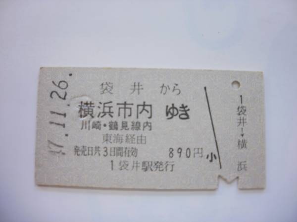 - 硬券/乗車券/国鉄/袋井~横浜市内ゆき 890円 47.11.26/9434