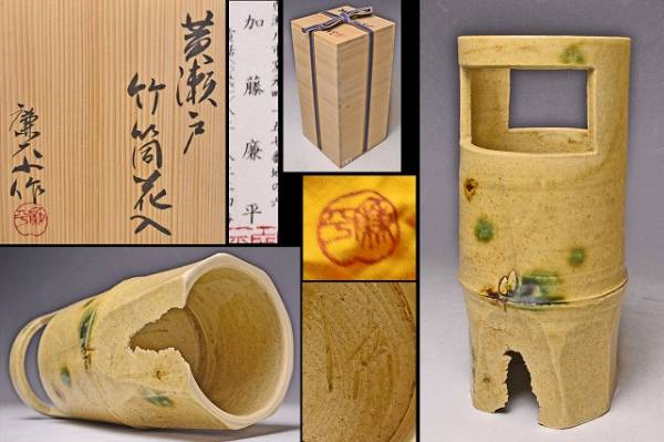 - 加藤廉平 ★ 黄瀬戸竹筒花入 ★ 共箱共布栞 ★ 市 無形文化財 ★ 加藤錦三