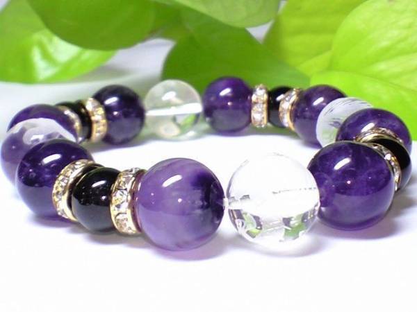- 14ミリ素彫四神獣水晶・天然紫水晶アメジスト・黒瑪瑙