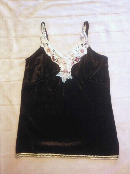 > 新品同様 キャミソール 小花 刺繍 レース ベロア ベルベット 黒 トップス カットソー インナー Tシャツ重ね着 パーティー ロリータ