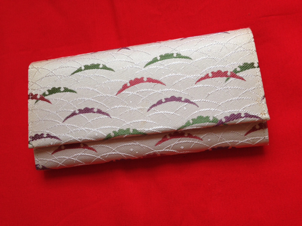 - 露芝紋かかえバッグ 銀地に緑赤紫の模様 美品 021101