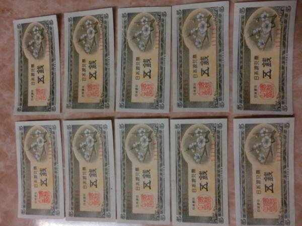 - (11113 )★ 日本銀行券A号5銭 梅5銭 準未使用~ 10枚 ★ No.90