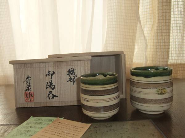 - 秀泉窯 織部 夫婦 御湯呑 木箱付 美濃焼 未使用品