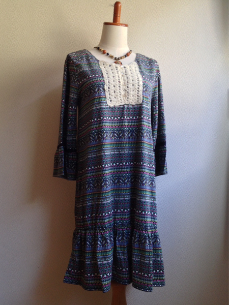 - ★エスニック柄★胸元ニット可愛い長袖チュニックワンピ★M★