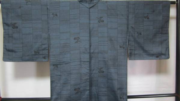 > 【桐輪】平紬☆送料無料☆未使用品*仕付け糸付き{正絹*越後.十日町*平紬*袷仕立*着物}*身丈158-裄63*黒地*藍糸の草葉と幾何文*№3241943
