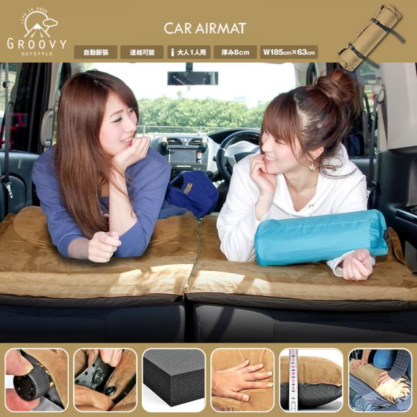 - カーエアマット 2枚 自動膨張式 連結可能/コンパクト収納/185cm×63cm×厚み8cm ライトブラウン 高密度ウレタンフォーム