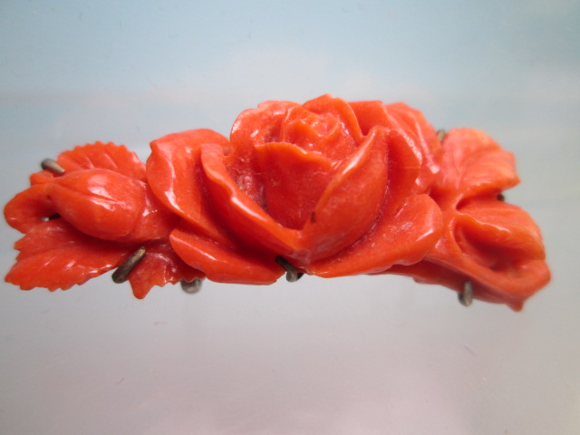 - ☆アンティーク・本珊瑚 赤珊瑚薔薇の花彫刻の帯留め 7,15g