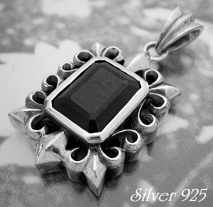 - シルバー925銀の天然石オニキス[レクタングルカット]付 フレア百合紋フレームペンダント/S&A silver