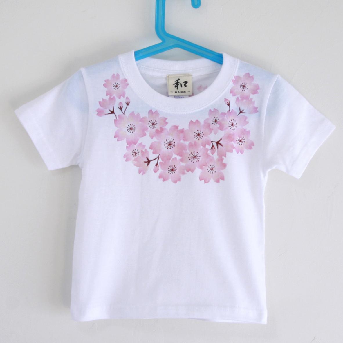 - 子供服 キッズTシャツ 150サイズ ホワイト コサージュ桜柄 Tシャツ ハンドメイド 手描きTシャツ 和柄 春 プレゼント