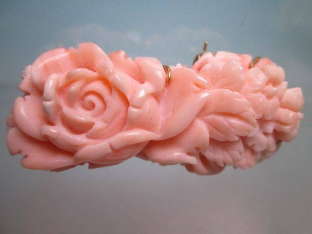 - ☆本珊瑚 薔薇の花と小花彫刻のブローチ兼帯留め 27g