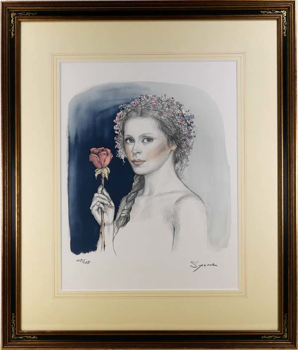 - 芝田米三 「花を持つ女」 リトグラフ 額装