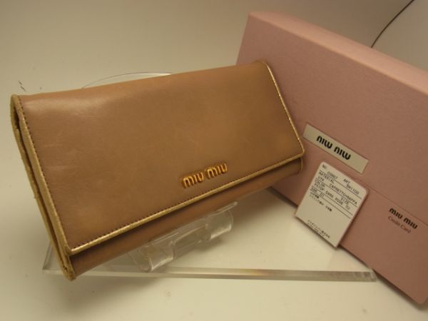 > $ 良好品 $ 箱 付き! ◆ miumiu ◆ ミュウミュウ ◆ ゴールド レザー 長財布 ◆ ミルク チョコレート色 ◆ 送料無料!!