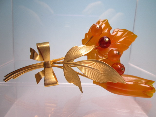 - ☆天然琥珀玉飾り花束の大振りな 10,5cm ブローチ 22g 未使用品