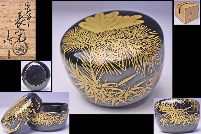 - 川瀬表完 ★ 蒔絵棗 ★ 松竹梅 の 模様 ★ 共箱 ★ 京都 の 塗師 ★ 茶道具 ★豪華な意匠 ★