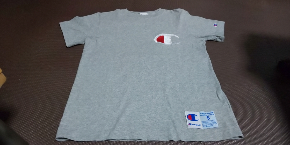 - 新品チャンピオン、グレー、ロゴ刺繍、半袖ストレッチトップス サイズS