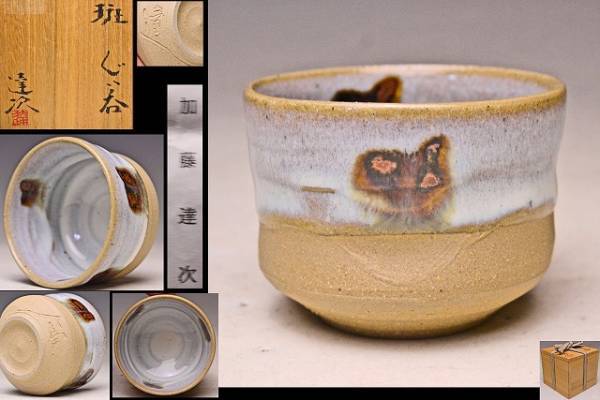 - 加藤達次 ★ 斑ぐい呑 ★ 共箱栞 ★ 瀬戸で作陶 ★ 藁灰釉 水色 ★ 検 斑唐津