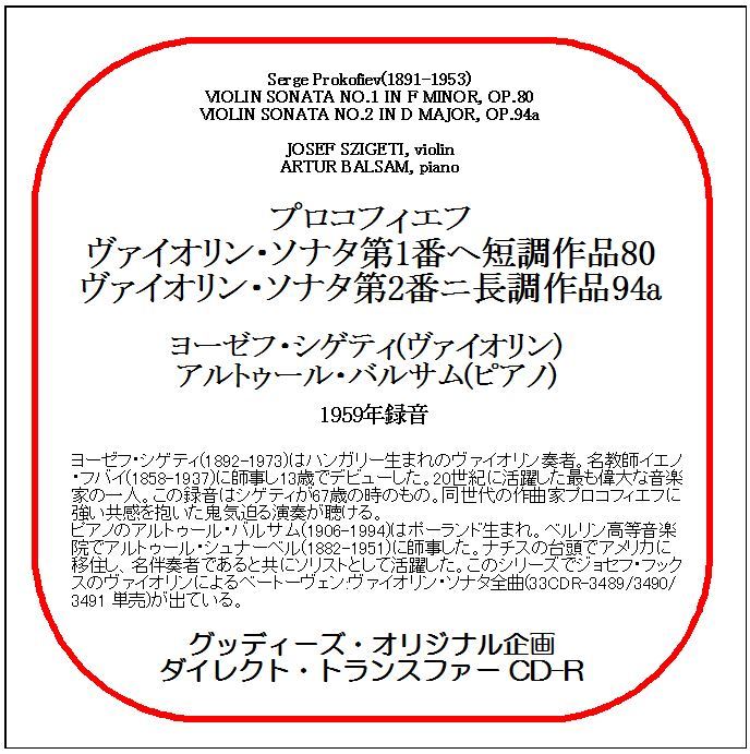 - プロコフィエフ:ヴァイオリン・ソナタ第1&2番/ヨーゼフ・シゲティ/ダイレクト・トランスファー CD-R