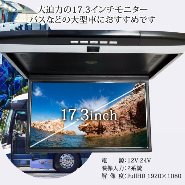 - miniHDMI ポート搭載 microSDカード USB IR(赤外線)対応 17.3インチ フリップダウンモニター スピーカー LEDルームランプ 内蔵 120度展開