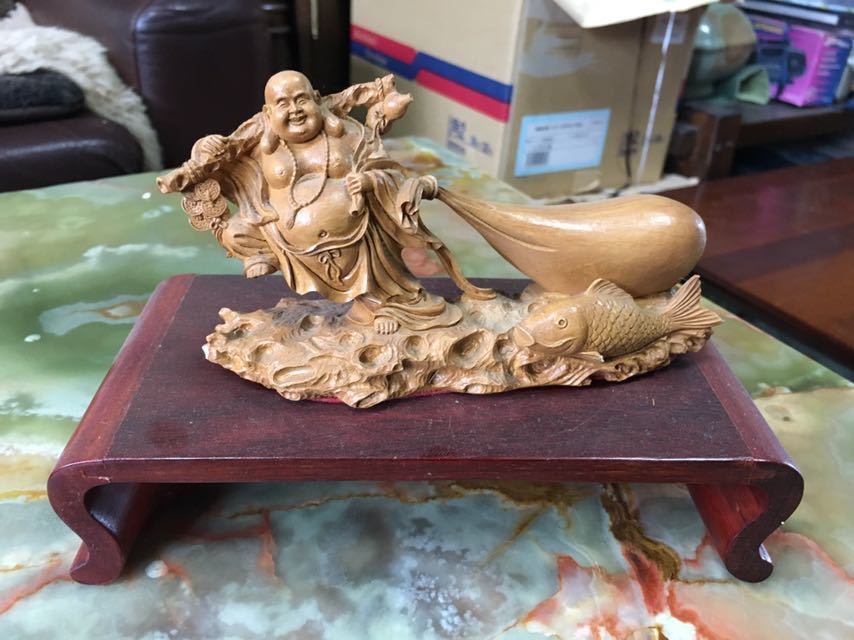 - 布袋 七福神 木彫 縁起物 置物仏教美術 中国美術 つやつやの頭と袋が魅力的! 疫病退散コロナ退散健康祈願 家内安全招福万来!