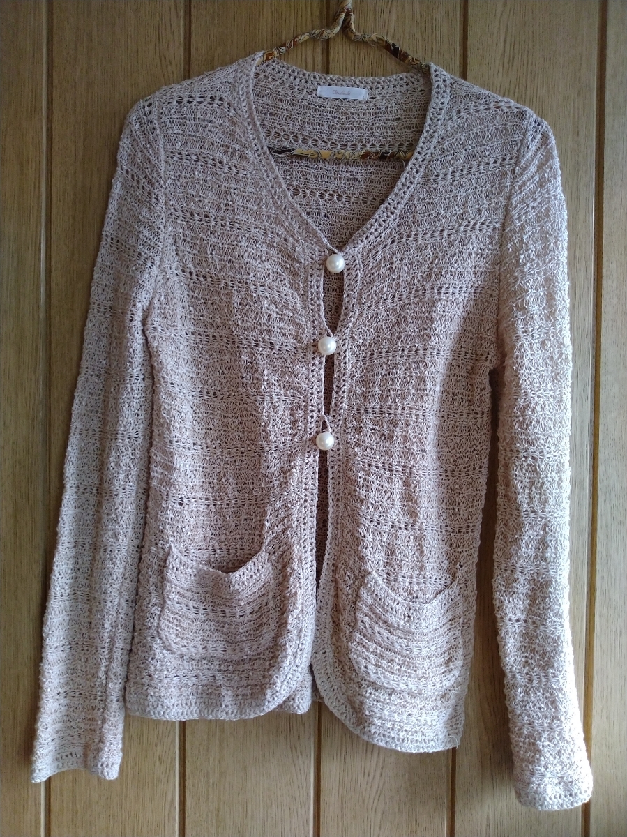 - 中古 Te chichi テチチ 編み編み カーディガン 麻混 大きなパール調ボタン