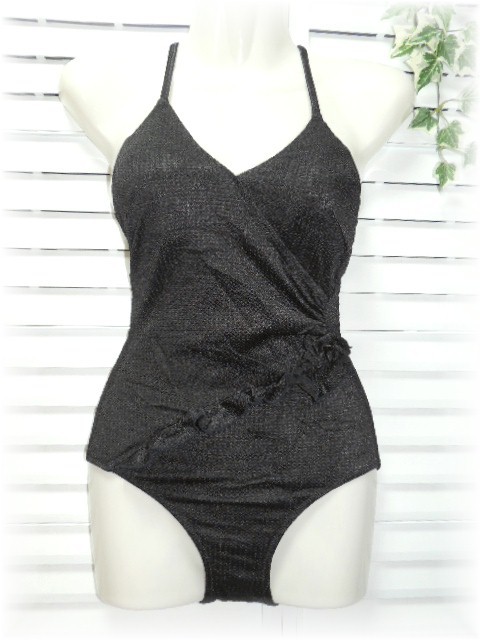 - Nikki 日本製 バッククロス ワンピース水着 9号/M ブラック×フリルとお花飾り 凹凸生地