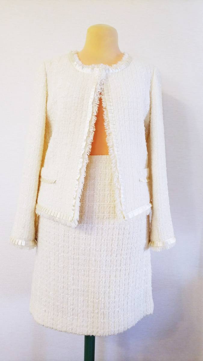 > 美品 STRAWBERRY FIELDS ストロベリーフィールズ ジャケットスーツ 白 セレモニー パーティー ホワイト クリーニング済 スカート
