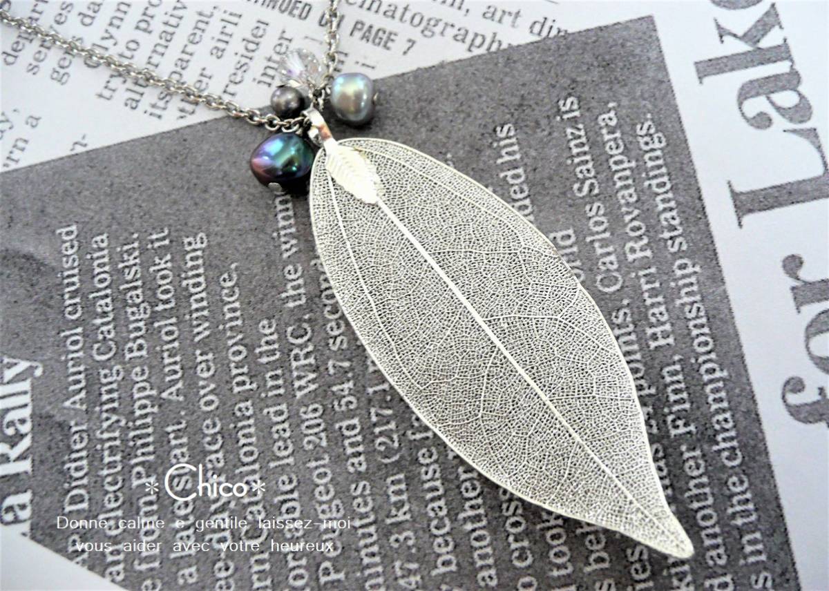 > ■65cm■シルバー透かしメタル リアルリーフ&ブラック淡水パールetc ハンドメイドネックレス ♪ ★2点以上送料無料!★