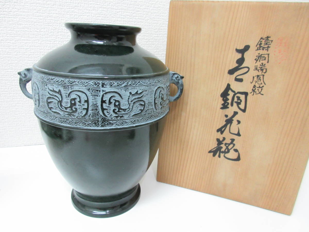 - 極美品■青銅瑞鳳文 青銅花瓶 耳付 木箱入り 管理2003 P-6